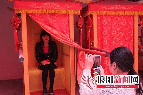 逛完了“热带雨林馆”后,记者再带您去看看“沂蒙山农耕文化博物馆”。这里也是人头攒动,除了紧张施工的工作人员外,一些旅行社的负责人也按捺不住好奇之心前来实地查看。姚丽伟就是其中的一员,她和一起前来的员工很快被这里的美景吸引,坐一坐大花轿、摸一摸老物件,手里的手机也“咔嚓咔嚓”照个不停。