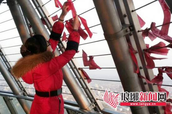 市民将福带系在高塔上