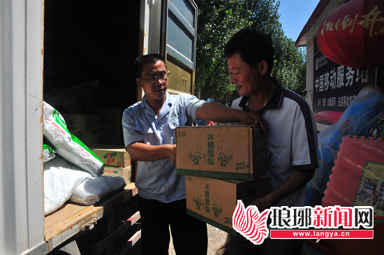 在开展“非盐”业务中,沂南盐业公司“卖盐郎”宋明峰队长(左)将日用商品,送到位于马牧池偏远村落的农家小卖店。