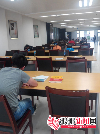 临沂市图书馆自修区,大部分人在看公务员考试书籍。