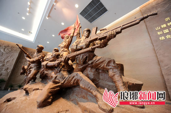 大厅雕塑展现的是在中国共产党的坚强领导下,沂蒙军民万众一心,同仇敌忾,并肩战斗,夺取胜利的场景。