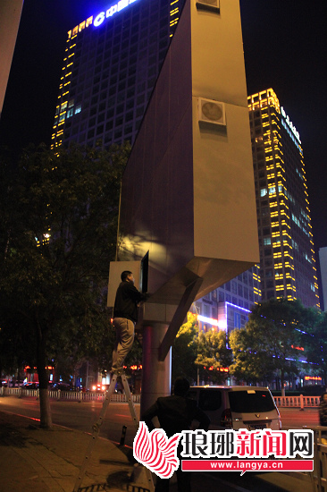 有关传媒公司工作人员在调整LED电子屏亮度