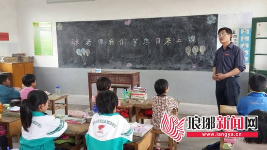 学生们在黑板上写下“张老师我们等您回来上课”