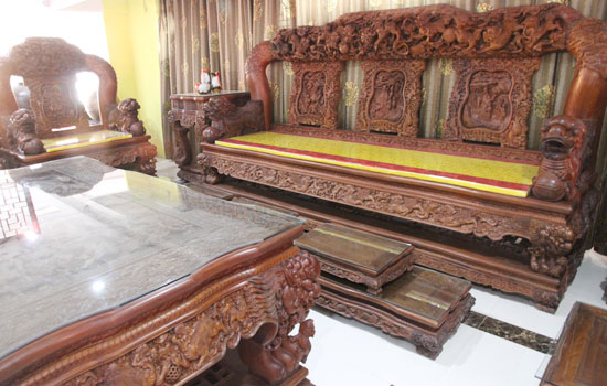 展览会上除了众多黄花梨、小叶紫檀、大红酸枝等名贵精品红木家具外,部分珍藏的明清家具、仿古家具、高价值藏品古旧家具、收藏艺术品、雕刻艺术品等也将悉数与参观者见面。在一楼展厅,由图腾红木馆定制的举世唯一的盛世雄风沙发23件套震撼亮相,作品原材料选取46.7吨缅甸花梨原木,参与制作团队50余人,由国内顶级专家团设计,国内顶尖工艺美术大师带领20名雕刻技师、25名高级木工,从开料、取料、烘干、打磨、雕刻、修坯、组装、成品上蜡等,历时757天,参加“收藏东作”获得全国金奖。