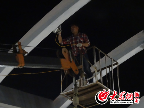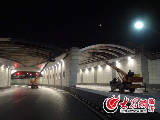 6月10日晚上,临沂市园林局隧道管理办公室组织施工单位对三河口隧道敞开段弯管钢梁进行打磨、养护、喷漆、除锈。