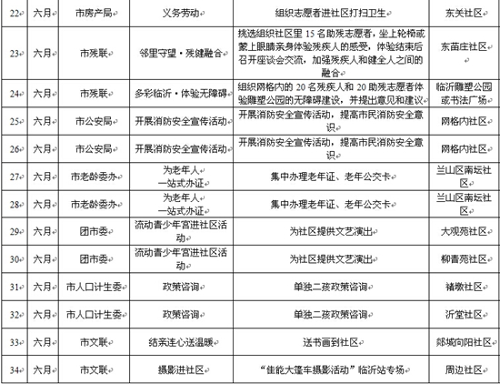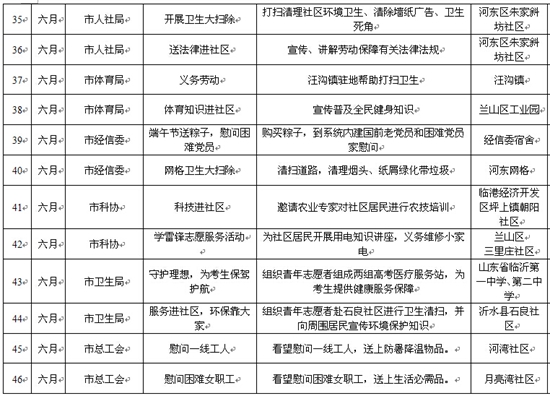 今天,大众网记者从临沂市文明办获悉,为贯彻落实中央、省、市“关于深入推进社区‘邻里守望’志愿服务活动”的有关要求,确保社区志愿服务活动扎实有效开展,临沂市定于6月14日集中到社区开展志愿服务活动,6月份共有46场志愿服务活动,包括义诊、义务劳动、政策咨询、慰问困难群众等。