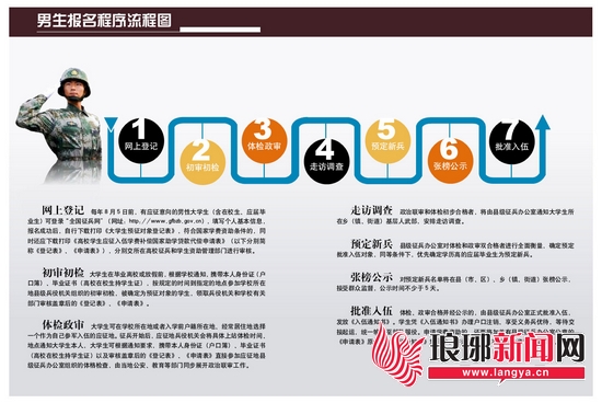据了解,到目前为止,山东省网上报名的青年已超过4.5万。此次征兵共分六个流程。分别是:登记报名、现场确认、预征管理、体检政审和受理咨询举报。12月31日以前年满18周岁的男性公民,可以在当年6月30日前登录征兵网进行兵役登记和应征报名,申请当年缓征的可只进行兵役登记。其他青年可在8月1日前参加网上应征报名。