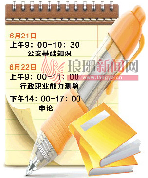 根据考试安排,笔试时间为6月21日、22日两天。6月21日上午9:00至10:30为公安基础知识;6月22日上午9:00至11:00为行政职业能力测验,6月22日下午14:00至17:00为申论。所有报考者均须参加行政职业能力测验和申论两科考试,其成绩方可有效。
