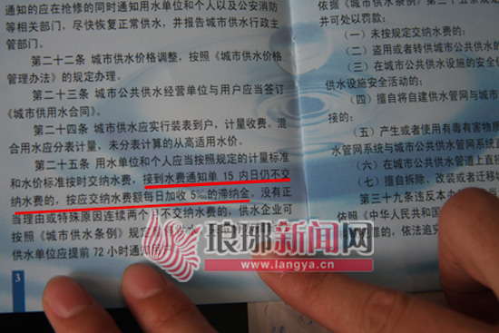 针对高女士家的情况,梁主任称,该住户从2012年7月份开始就没有交纳水费,收费人员已经多次到小区张贴水费催交单,尽到了告知的义务。“如果逾期不交纳水费的话,系统就将自动生成滞纳金。”梁主任说。