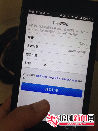 “花19.9元给手机屏幕上个保险,我觉得挺划算的。”网友“小雨”说。她告诉记者,去年自己刚买了3个月的三星智能手机不小心掉到地上,屏幕摔碎了,光换屏幕就花了800元。“想想就肉疼。”她说。