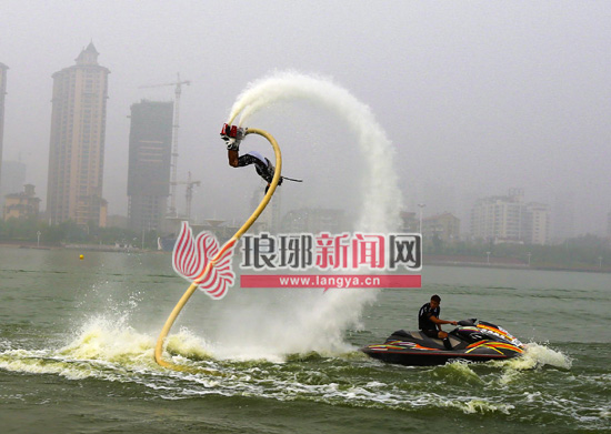 7月17日,在沂河南湖心岛水域,参加2014中国临沂(国际)花式摩托艇表演赛的选手们正在紧张的进行着赛前训练,flyboard训练时溅出的水花在空中形成了一道漂亮的“圆月弯刀”。