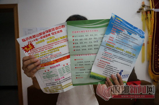 “他们有的是外地人,骗了钱就跑,连个人影都找不着。”这名工作人员指着宣传单说,“你看这个‘协议保过班’单科1000块钱,不过还退学费,一看就是骗人的,千万不能信。”