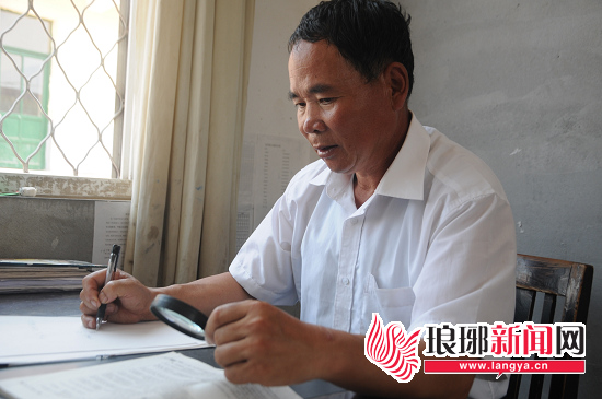 杨久迎一直拿着放大镜看书、批改作业,放大镜已经成了他的生活必需品