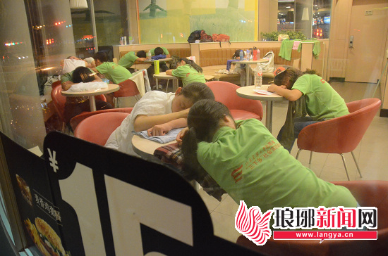 在麦当劳睡觉的队员,因为店里的规定,他们只能趴着