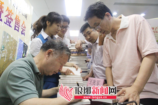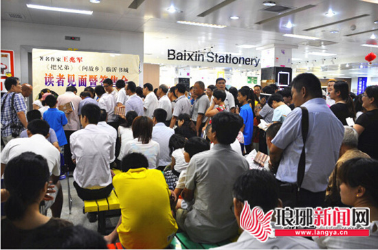 新书签售会于上午10点钟开始,简单开场白还没读完,抱着新书索要签名的读者就已经按捺不住,一下子涌了上来,偌大的新书签售会现场被挤得水泄不通。从一开始,王兆军就被包围在了人群的中央,读者的热情一浪高过一浪,甚至有读者打出了欢迎王兆军回家的横幅。今天,慕名而来的,有中学生,有老师,有工人,有医生,有退休干部,他们几乎包含了所有年龄段、包含了所有职业。其中,有一位叫薛宝森的老人,今年已经85岁了,当他拿到王兆军签名的新书后,高兴地告诉记者,为了求得王兆军的新书,他是今天一大早从临沭县赶过来的。他已经读王兆军的书20年了,这三本书,他要用一个月读完。