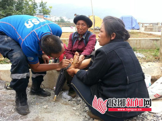 山东救援队队员为从红石岩村下来的村民处理脚部伤口。