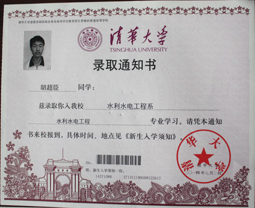 据悉,因为家境贫寒,胡超臣的哥哥未读完高中就辍学打工供弟弟胡超臣读书,然而当一纸清华大学的录取通知书寄到他们手上时,笼罩在一家人心头的,除了激动、除了兴奋、除了欢喜,还有一丝淡淡的忧虑:那就是学费。胡超臣的家人经多方筹集还缺一部分学费没有筹到,日前,由《草帽姐秀场》赞助的5000元梦想基金成功帮他的家人打消了顾虑,实现了他的清华梦。他表示,一定好好学习,学有所成,以优异成绩回报家乡,回报所有关爱他的人。