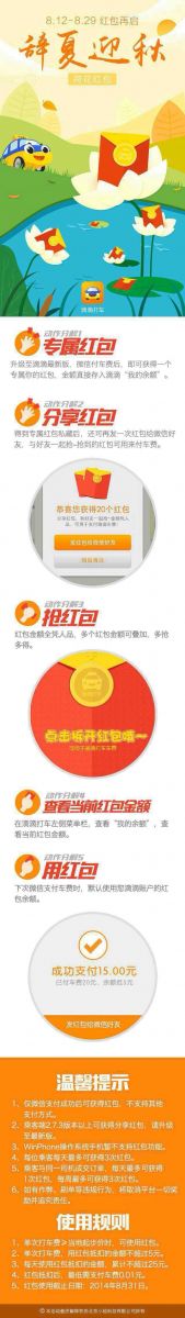 8月12日,滴滴打车宣布启动新一轮“荷花红包辞夏迎秋”用户红包活动。这是继此前“分享更有爱”、“全民嘉年华红包世界杯”、“要分享也要私藏”活动后,在夏秋换季之时面向用户端推出的新一季惊喜连连送红包分享活动。用户只需使用客户端2.7.3以上版本的滴滴打车,并通过微信支付打车费,即可在这辞夏迎秋的好时节,获取滴滴打车荷花双重红包大礼。