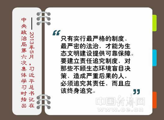 只有实行最严格的制度、最严密的法治,才能为生态文明建设提供可靠保障。要建立责任追究制度,对那些不顾生态环境盲目决策、造成严重后果的人,必须追究其责任,而且应该终身追究。