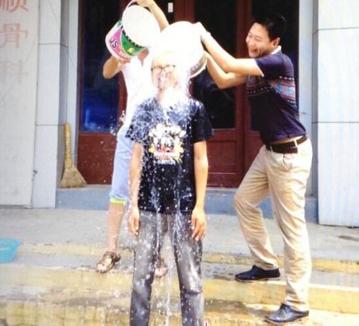 除了普通市民的参与,临沂的大V们也紧跟形势。微博名人李刚也在21日接受了“冰桶挑战”,李刚表示,希望能够通过自己的行动让更多的人认识罕见病,呼吁大家对罕见病患者的关爱。作为一名癫痫病患者,他对罕见病人的痛苦感同身受。从五岁起被确诊癫痫病的李刚一直在与疾病做斗争,加之患有习惯性脱臼,他甚至不敢轻易活动。所以在网上看到“冰桶挑战”的活动后,李刚也想着为罕见病患者做点什么,“虽然癫痫病可能称不上罕见病,但是它的发病率也很低,而且非常痛苦,所以对罕见病患者我是感同身受。”李刚说。21日中午,为了防止挑战过程中出现脱臼,他特地选在常去治疗的一家骨科膏药店门口进行,而且他还通过微博公益平台捐了100元,“能够为他们做点事情我觉得挺好的。”