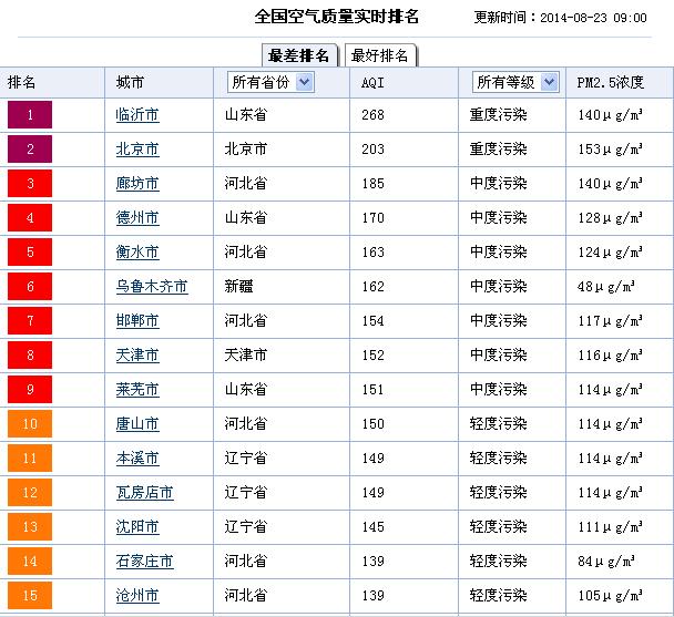 临沂网讯 今天临沂空气质量极差,在PM2.5监测网的全国空气质量实时排名中显示,临沂属于重度污染,PM2.5浓度为140μg/m³。