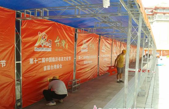 随着第十二届书圣文化节进入倒计时阶段,各展区的筹备活动也在紧锣密鼓地进行。25日,记者来到沂蒙路与涑河南街交会的万兴都广场,看到工作人员正忙着搭建展区,布置会场。