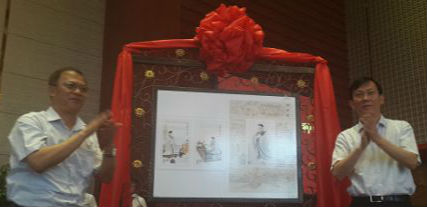 临沂市政府副市长马崑与山东省邮政公司副总经理姜文渊为《诸葛亮》邮票揭幕