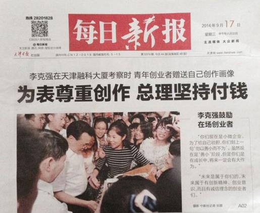 9月11日,李克强总理来到融科大厦考察,刘怡辰自告奋勇为总理送上自己创作的画像,并得到李克强总理的称赞。