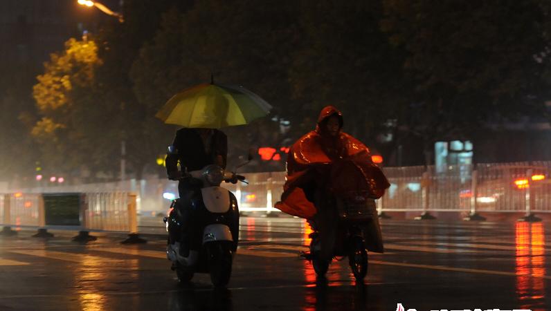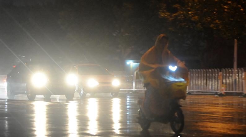28日的一场秋雨让气温骤降,图为晚上在雨中行进的车辆
