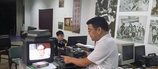 黄立宇在翻看当年去北京拍摄的谷牧影像