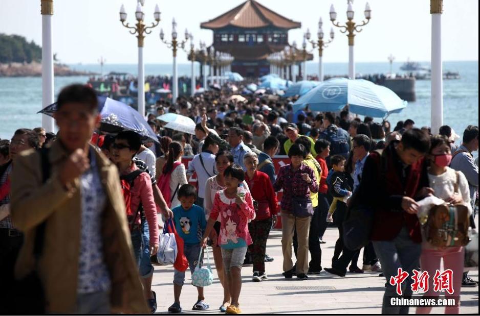 青岛栈桥人涌如潮 栈桥变“人桥”