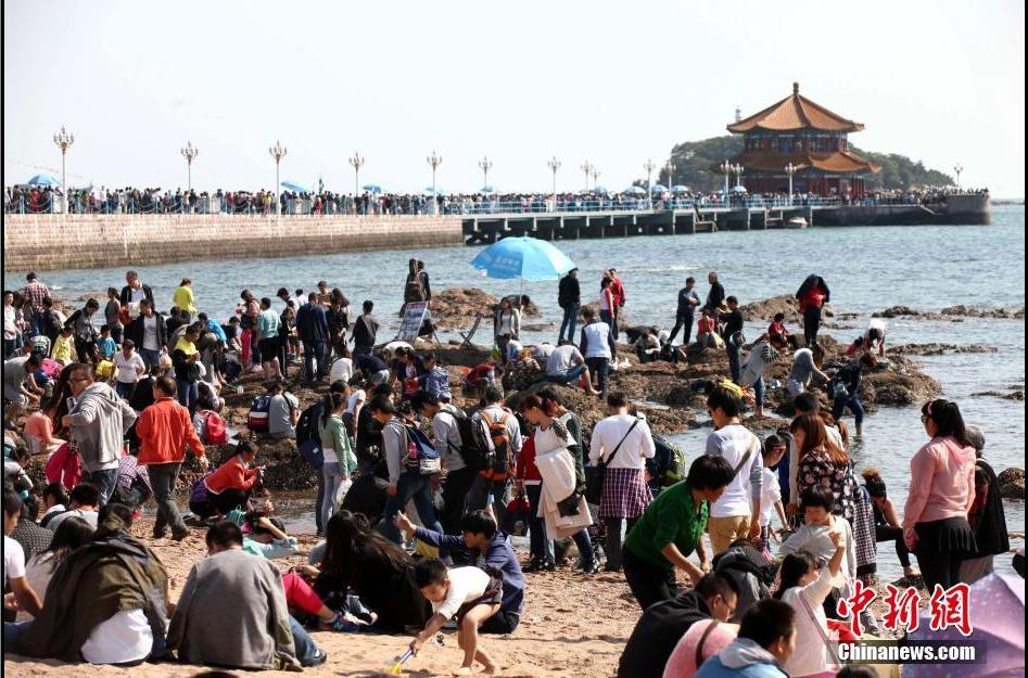 青岛栈桥人涌如潮 栈桥变“人桥”