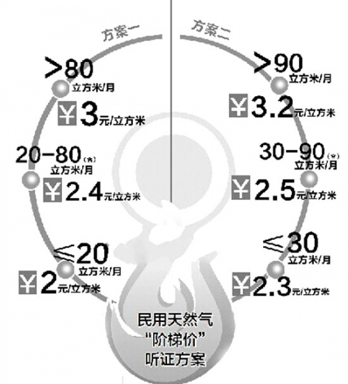3日,摸底酝酿已久的民用天然气“阶梯价”听证方案正式晒出,两套方案除均拟将气价分成三档,并共同规定对持有城乡最低生活保障证、特困证的用户,一档气价仍按现行价格执行外,方案一较方案二拟定的每档阶梯气价及涨幅均较小,但每档气量递进的“门槛”也低。