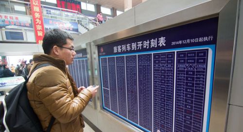 12月10日,一位市民在临沂火车站售票厅内关注铁路新运行图。