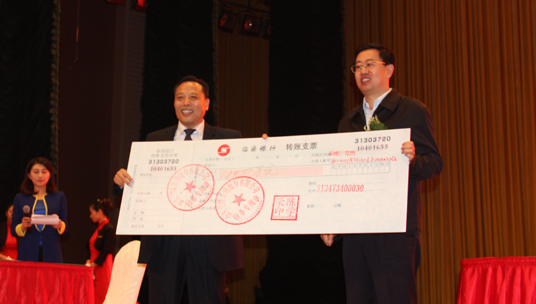 临沂市副市长侯晓滨(右)代表临沂慈善总会接受兰陵原酒竞拍善款100万元