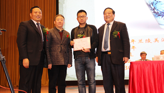爱心企业代表王先生以45万元(右二)拍得60年兰陵美酒原酒