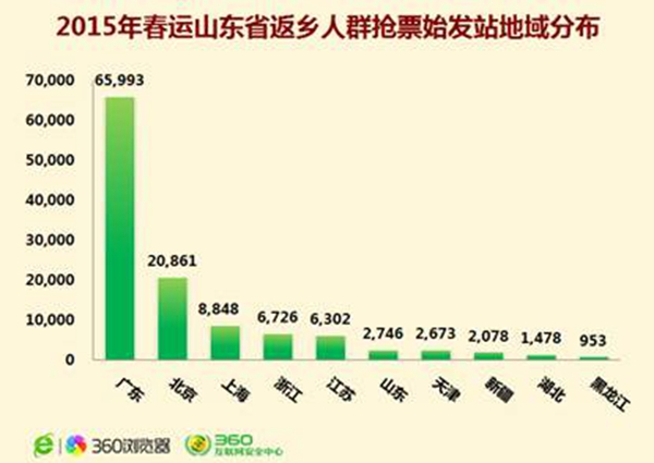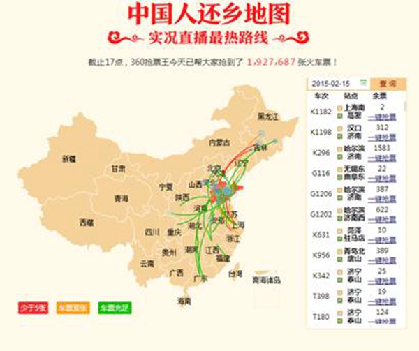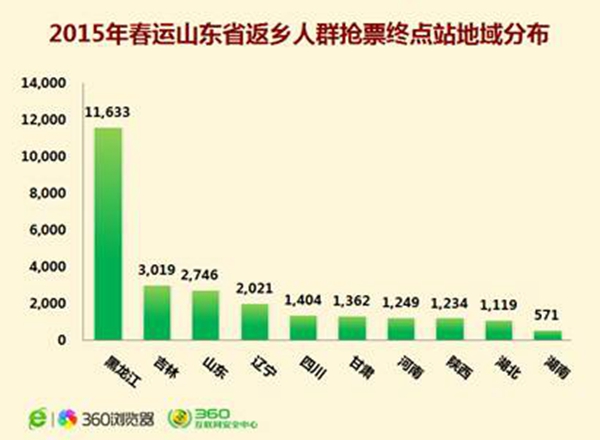 尽管途经临沂站或由此始发的列车票源宽裕,但全国铁路抢票却随着春节放假时间的陆续公布而日趋白热化。今年,360浏览器抢票“神器”推出了可视化的“中国人还乡地图”,记者从中看到自12月7日春运抢票开始至今,广东省网民抢票最为火爆,在出行排行榜中居于第一位,而全国去往武汉还乡的旅客最多。据其大数据分析,春运期间全国回往山东的网民购票量位列全国抢票终点省份第11位,而山东网民去往黑龙江的占比最高,超过全部订票量的两成还多,其次吉林、辽宁、四川、甘肃等目的地也较热。