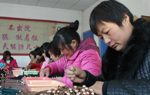 蒙阴县心玉饰品加工点,带动了周边的妇女居家灵活就业,大家可以到加工点干活也可以带回家中,时间自由安排。