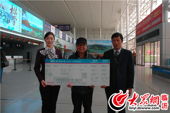 大众网临沂12月21日讯(记者 满健 通讯员 李昱玫)21日,临沂民航2014年旅客吞吐量首次突破90万人次,前往大连的旅客叶先生幸运的成为第90万名旅客,临沂机场公司副总经理代表临沂民航向其赠送了纪念品。