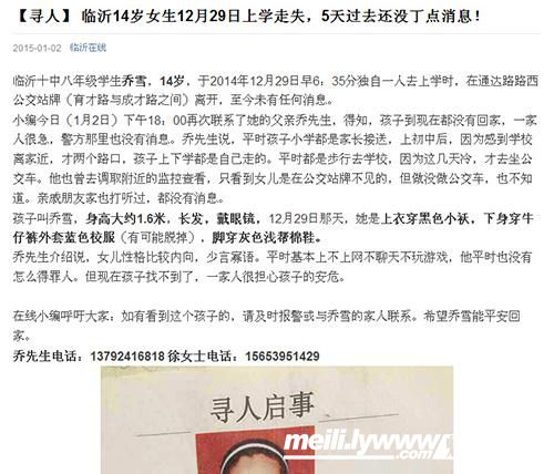 昨天下午,也就是在乔雪上学失踪的第5天,在线记者联系了乔先生,得知孩子还没有找到后,记者通过临沂在线微信平台(微信号:lywww0539)于1月2日晚上7:32分发布了寻人消息,关注在线微信的网友们纷纷给予转发,扩散消息,并帮助留心寻找。截至今天中午10:30分,短短15个小时,阅读量达到3.5万,使更多的人了解到孩子的有关情况。