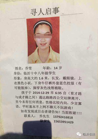 临沂14岁失踪女学生乔雪找到了!平安回家,感谢网友!