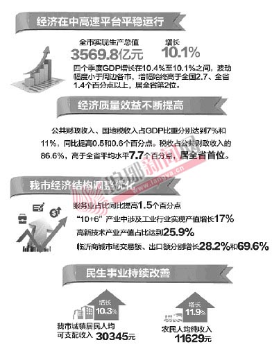 在2014年,我市经济社会发展呈现四大特点。首先是经济在中高速平台平稳运行。经初步核算并由省统计局审核,全市实现生产总值达到3569.8亿元,增长10.1%,四个季度GDP增长在10.4%至10.1%之间,波动幅度小于周边各市,增幅始终高于全国2.7、全省1.4个百分点以上,居全省第2位(首位市增长10.2%,经济总量却不足我市60%),为2004年以来在全省最好位次。而财政收入、国地税收入增速则分别快于全省6和7.3个百分点,均居全省第1位。工业增加值、固定资产投资列全省第2位,全部工业行业、七成以上工业企业产值实现增长;社会消费品零售总额、进出口等指标增幅都好于预期,快于全国全省,在全省位次保持稳定或前移,多数指标在全省位次达近年来最好水平,稳定在中高速发展平台上。