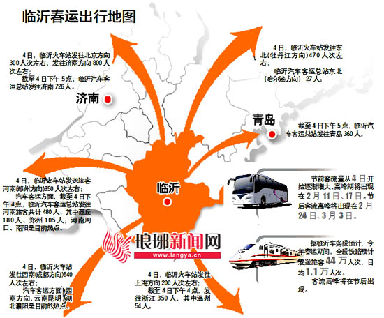 4日,临沂车务段合计发送旅客约8300人次,开局“平淡”。究其原因,铁路部门分析认为,节前客流相对分散,自1月中下旬起各大中专院校开始放假,至春运开始时大批学生流已运输完毕。真正的客流高峰将在节后出现,务工流将贯穿于整个节后春运,探亲客流主要集中在2月24日-28日(即农历正月初六至初十),大中专院校的开学日期大都集中在3月上旬,因此节后自2月21日(阴历正月初三)起,客流将呈现持续增长状态,探亲返程、务工流、学生流相互叠加,高峰凸显,将一直持续至春运结束。