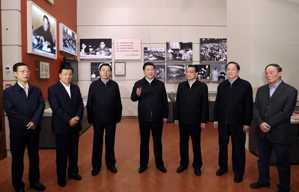 2012年11月29日,中共中央总书记、中央军委主席习近平和中央政治局常委李克强、张德江、俞正声、刘云山、王岐山、张高丽等来到国家博物馆,参观《复兴之路》展览。 新华社记者 兰红光 摄