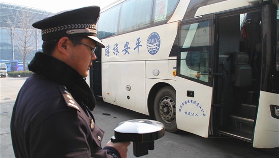 兰山公安分局汽车站站内派出所民警王平拿着远距离危爆品探测仪进行检查