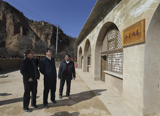 沼气池旁边窑洞的外墙上,是一幅手绘的宣传画。上面写着“自力更生、艰苦奋斗”八个大字。总书记招呼大家在这里合影留念。他感慨道,这幅画也40年了。