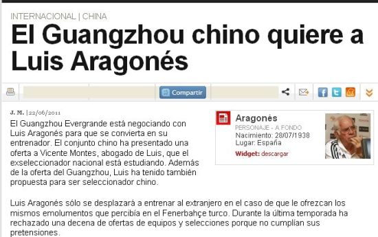 新浪体育讯 北京时间6月22日,据西班牙《阿斯报》称,中国国家队和广州恒大共同相中了前西班牙国家队主帅,带领西班牙夺得欧锦赛冠军的名帅阿拉贡内斯。据悉,广州恒大目前正在积极寻找世界级的名帅,他们非常渴望说服阿拉贡内斯来广州执教。