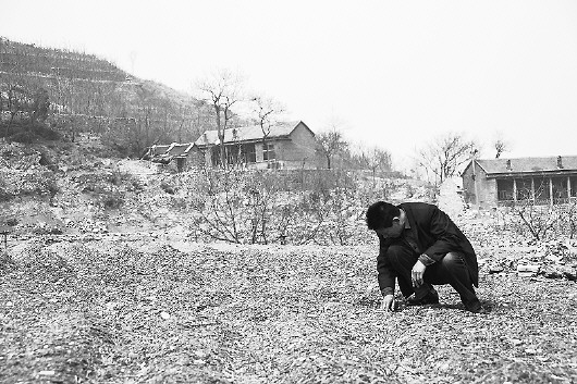 章丘市垛庄镇胡枝子村村支书胡圣雷翻看荒地土壤。(□记者 申红 马桂路 报道)
