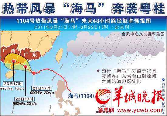 预计,“海马”先以8公里左右的时速向偏西方向移动,强度逐渐加强,后以时速15公里转向偏西北方向移动,将于今天白天逐渐靠近广东省中西部海面,并于今天夜间在台山到徐闻之间沿海地区登陆,登陆时中心风力可达9-10级。