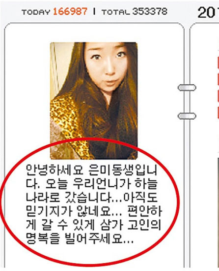 李恩美妹妹在她的博客留言(红圈处):“不敢相信姐姐已经在天堂了!”(图片来源:台湾苹果日报)